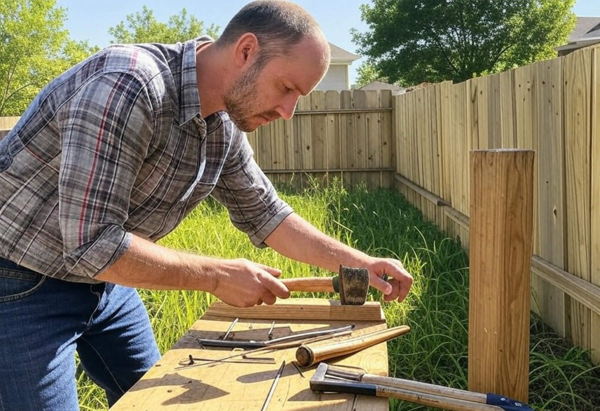 Generated by Grok - AI Prompt: A skilled worker repairing a wooden fence outdoors